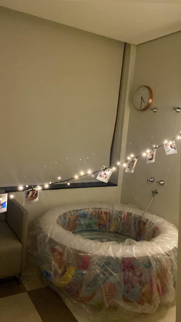 Fui direto para o chuveiro enquanto a banheira enchia. Entre um contração e outra meu doulo maravilhoso (Michel rs) foi arrumando a suíte com nossas fotos e luzinhas e colocando as nossas músicas. Essa ambientação foi muito importante.