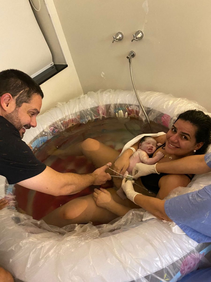 Por volta de 5h20 Dra Avelina fez o toque e estava com 9cm. Ela saiu para a antessala da suite, e segundo meu marido, uns 3 minutos depois, eu gritei que ela estava nascendo.