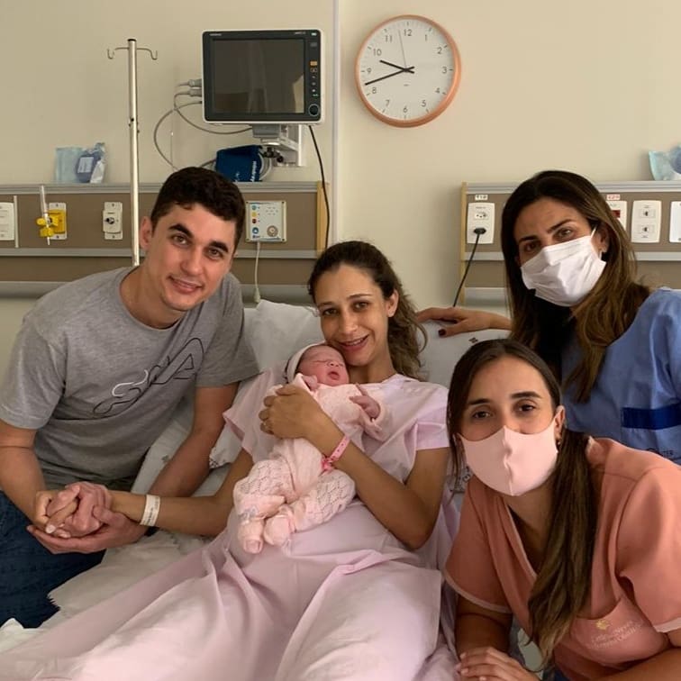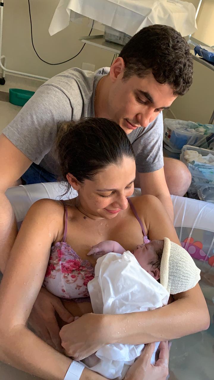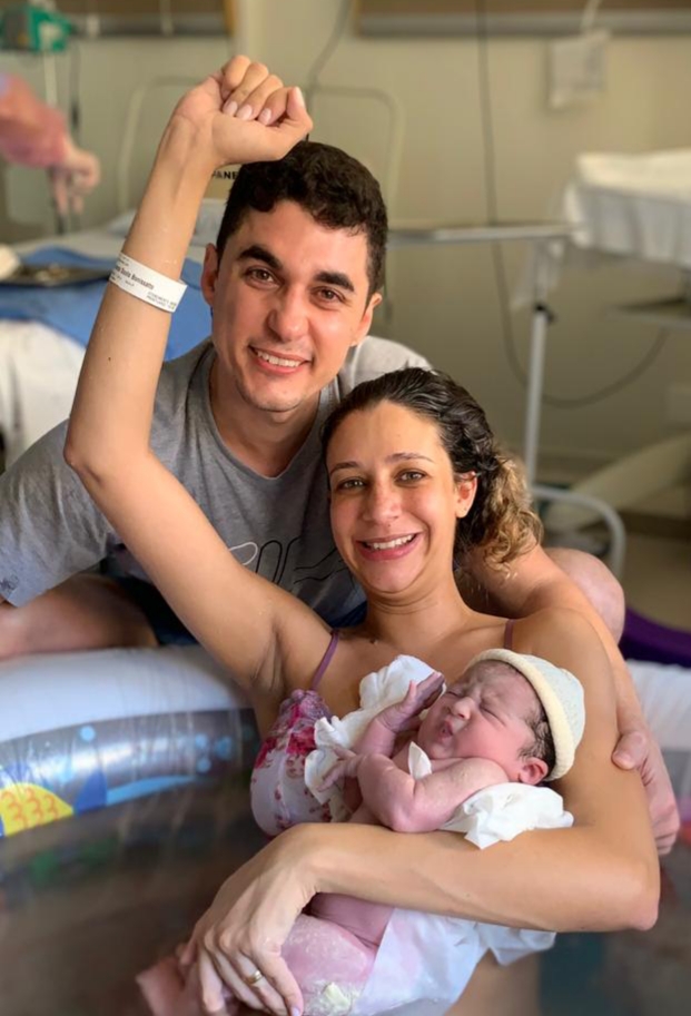 O tempo foi passando, a dilatação aumentando e de vez enquando ouvia o coraçãozinho dela batendo, tudo fluindo bem. Eu fazia força a cada contração, puxando o tecido que estava preso na cintura da EO e meu marido me abraçava segurando pelas minhas costas. Eu gritava, era uma dor desejada e pedia ajuda a Deus, a Jesus, eu ouvia a música de fundo e as vozes da equipe dizendo que eu estava indo bem e que ela tava chegando até que ainda dentro da bolsa aminiótica eu pude sentir a Lavínia. Como ela estava prestes a nascer a Obstetra solicitou que chamasse a Pediatra e foi nesse momento que os olhos do papai encheram de lágrimas e eu olhando para o rosto dele comecei a sorrir, nesse momento já senti uma pressão na região da pélvis, era minha bebê descendo. Logo em seguida senti a bolsa estourar e continuei fazendo força, pedi ajuda para a médica e ela me disse sorrindo e brincando, “só se for para puxar pelo cabelo, ela é cabeluda” imediatamente, coloquei a mão e senti o cabelinho balançando na água, ela tinha coroado, faltava pouco. Até que veio uma vontade de fazer força e uma sensação de queimação, chamada de “círculo de fogo” e eu sabia que em breve ela nasceria e eu seria a primeira a pegá-la no colo. E foi assim que aconteceu, fiz mais duas forças gritando “Vem Lavínia” e ela veio para meus braços, a emoção que senti é indescritível, já não existia mais nenhuma dor, era só Amor!