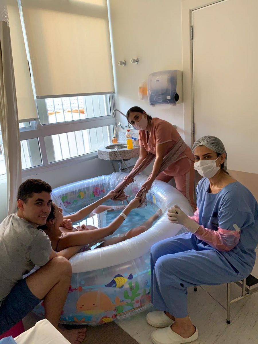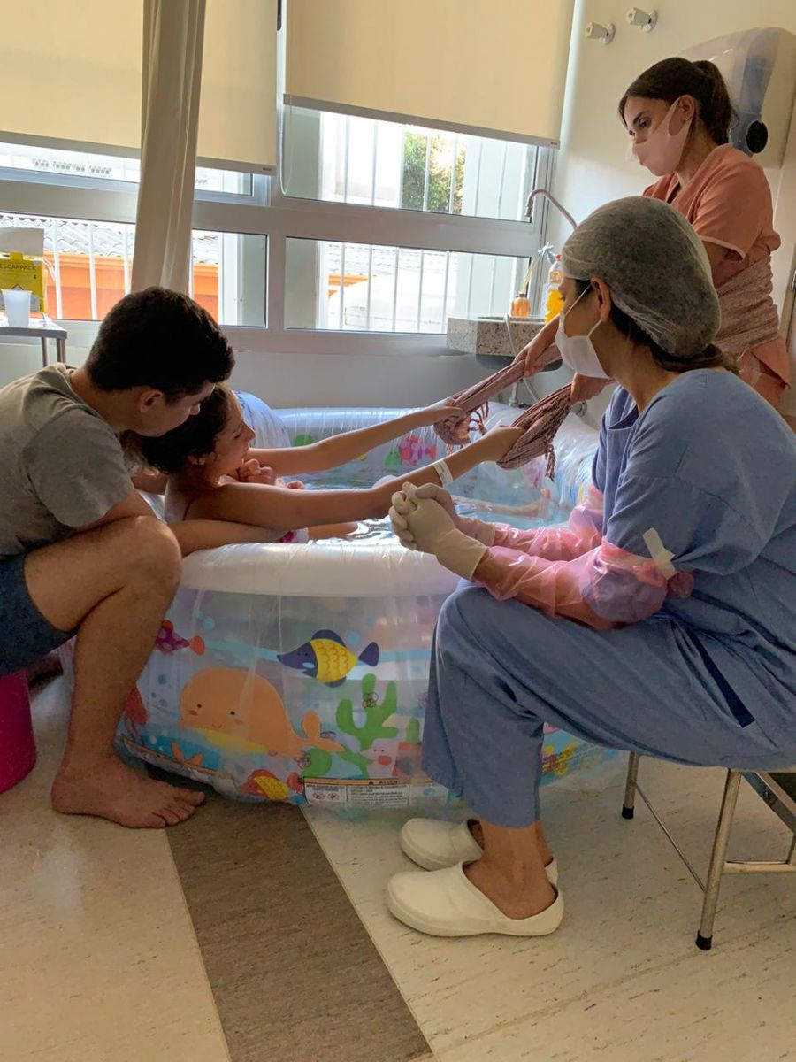 No caminho até a maternidade as dores continuavam o meu marido dirigia e eu estava no banco de traz acompanhada pela Enfermeira. Finalmente chegamos, nem percebi o caminho que percorremos até lá, na maternidade fui recebida pela minha Obstetra o que me deixou mais confiante de que todo planejado estava acontecendo. Fui direcionada a suíte de parto, vesti o top lindo que minha irmã me presenteou para eu usar no parto e entrei na banheira…