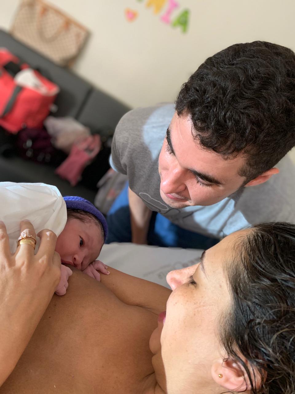 Logo em seguida, eu sai da banheira e fui amamentá-la pela primeira vez, nosso contato pele a pele ainda estava acontecendo de forma respeitosa, eu estava curtindo aquele momento e só depois ela foi pesada, medida e vestida. Tudo isso acontecendo ali, do meu lado e de forma descontraída, teve até bolão do peso e do tamanho, sabe quem acertou os dois? Mamãe!